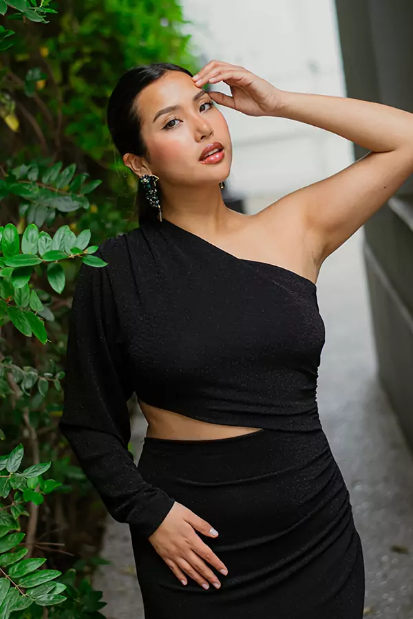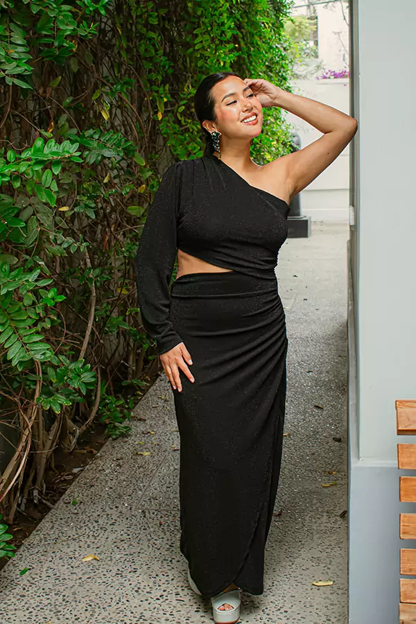 Nuestro vestido Amanda es muy tentador con su corte asimétrico y drapeados. Viene en una tela de brillos sutiles y elástica que se amolda al cuerpo.