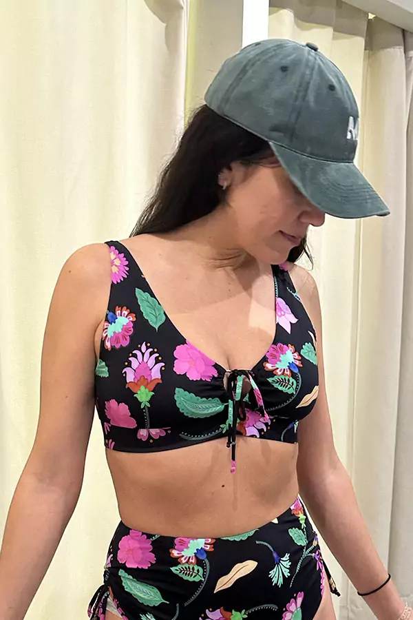 El top JAZMIN tiene un lazo regulable y lleva almohadillas removibles. El elástico de la base ayuda a sostener y realzar el busto. Tiene protección UV50+ y cuenta con muy buena resistencia a las sales marinas y al cloro.