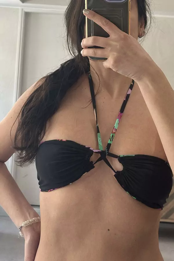 El top SOFIA es reversible del estampado Rusia a negro. Tiene muchas formas de usarlo que puedes ver en las fotos. La tela es mega suave entonces no duele cuando se amarra al cuello y se amolda super bien al cuerpo. La tela es brasileña, ecológica y tiene protección UV50+ y cuenta con muy buena resistencia a las sales marinas y al cloro.